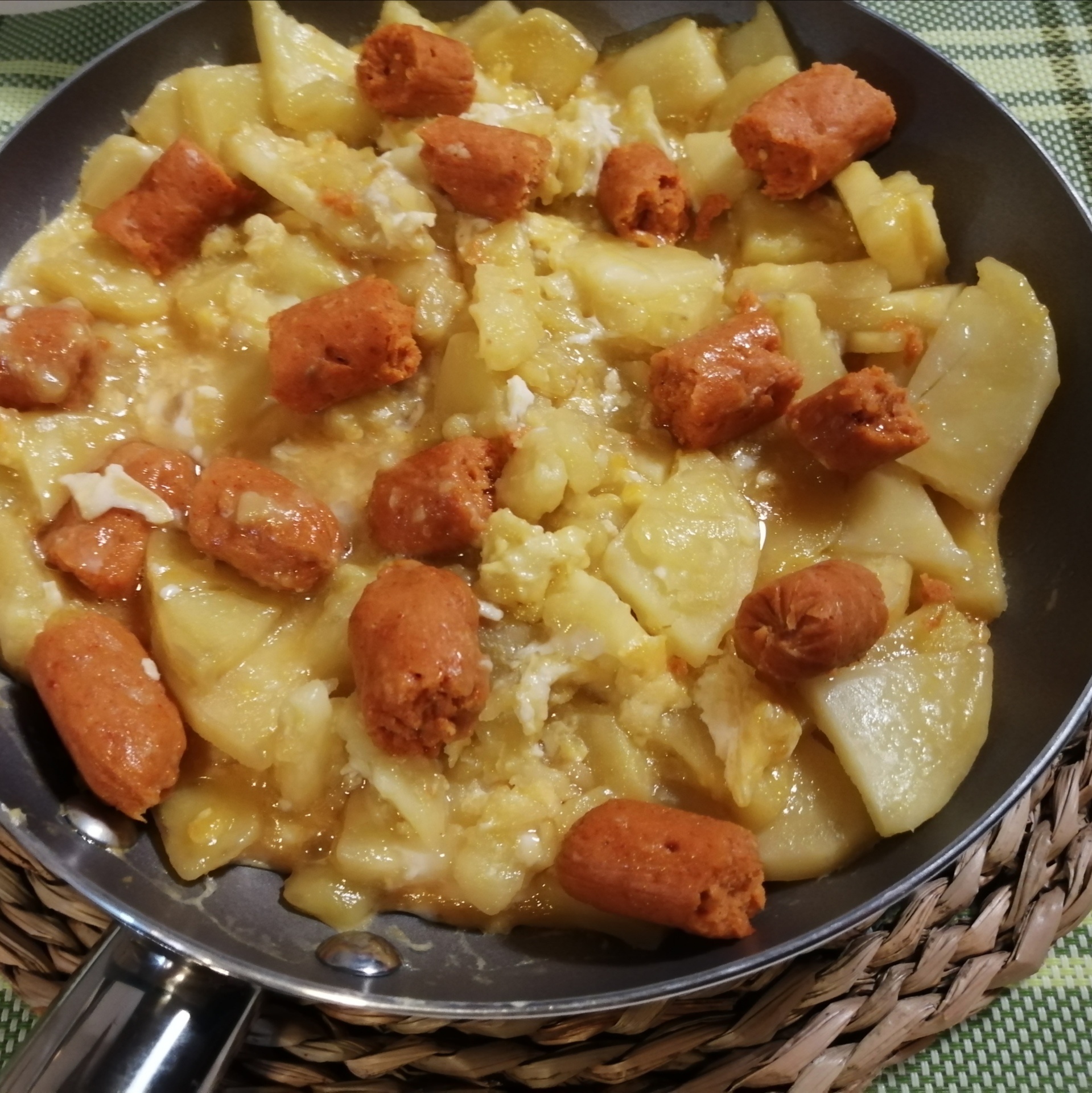 PATATAS, HUEVOS ROTOS Y CHISTORRA DE MERLUZA CON THERMOMIX®