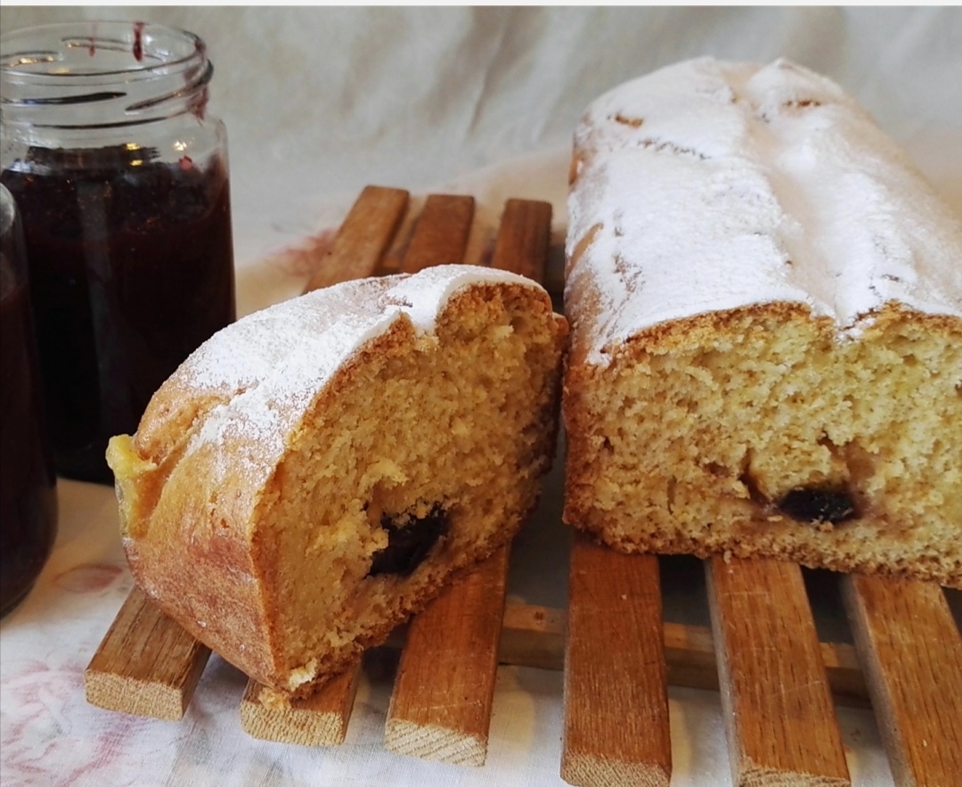 Vierte la mezcla en el molde y hornea 20-25 minutos (180°C). Retira del horno, deja templar 10 minutos, desmolda sobre una rejilla y deja que se enfrie completamente. Decora con 2 brevas y sirve espolvoreado con azúcar glas y cortado en rebanadas.