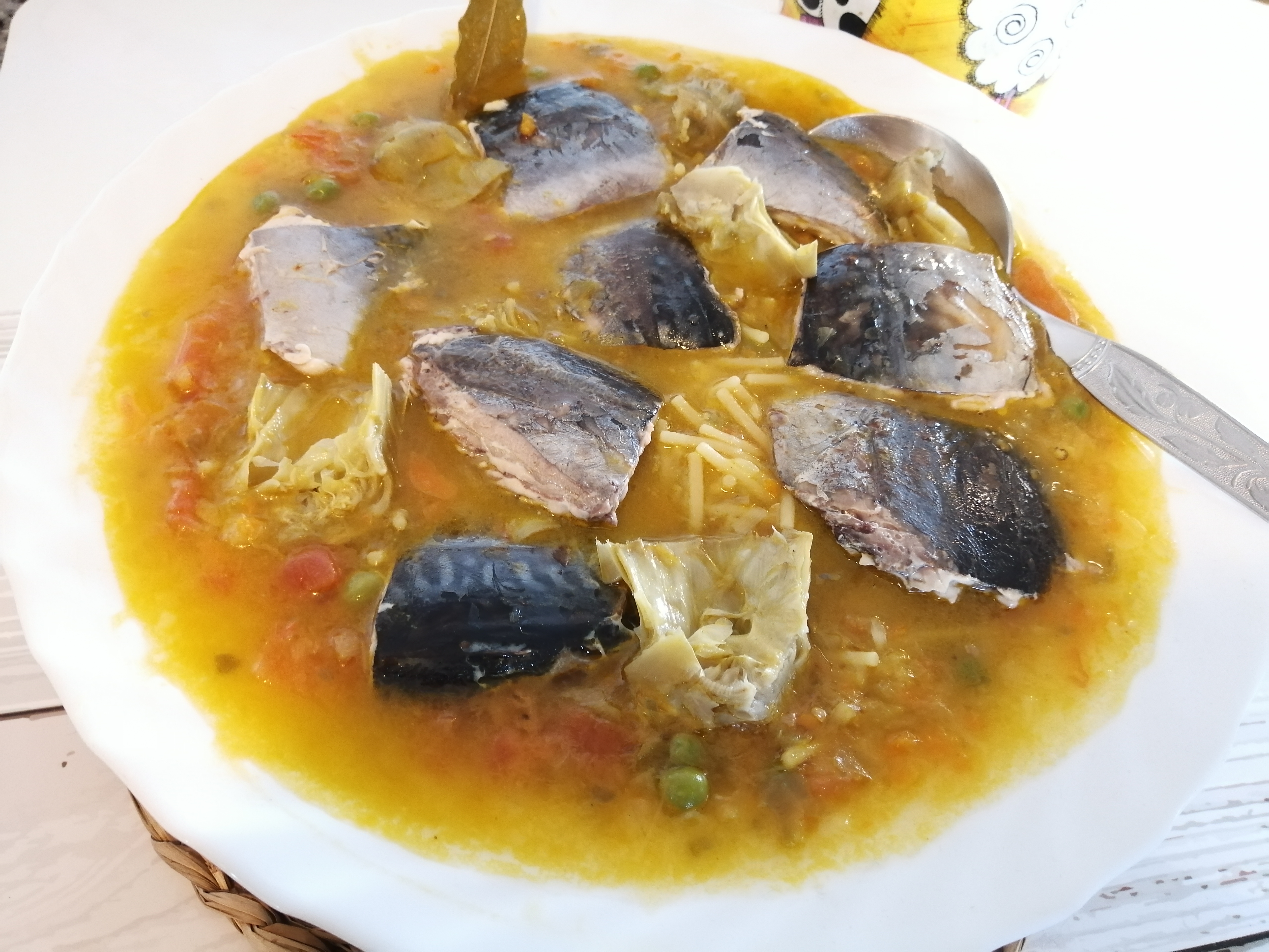 - Incorpora el laurel, el comino, los guisantes, la pimienta, el azafrán, los fideos, el caldo y la sal. Sitúa el recipiente Varoma en su posición y pon los trozos de caballa. Tapa y programa 13 min/Varoma/giro inverso /vel cuchara. Retira el Varoma, vierte el contenido del vaso en una fuente y extiéndae con la espátula. Distribuye la caballa sobre los fideos, sirve y disfruta de esta receta tan calentita.