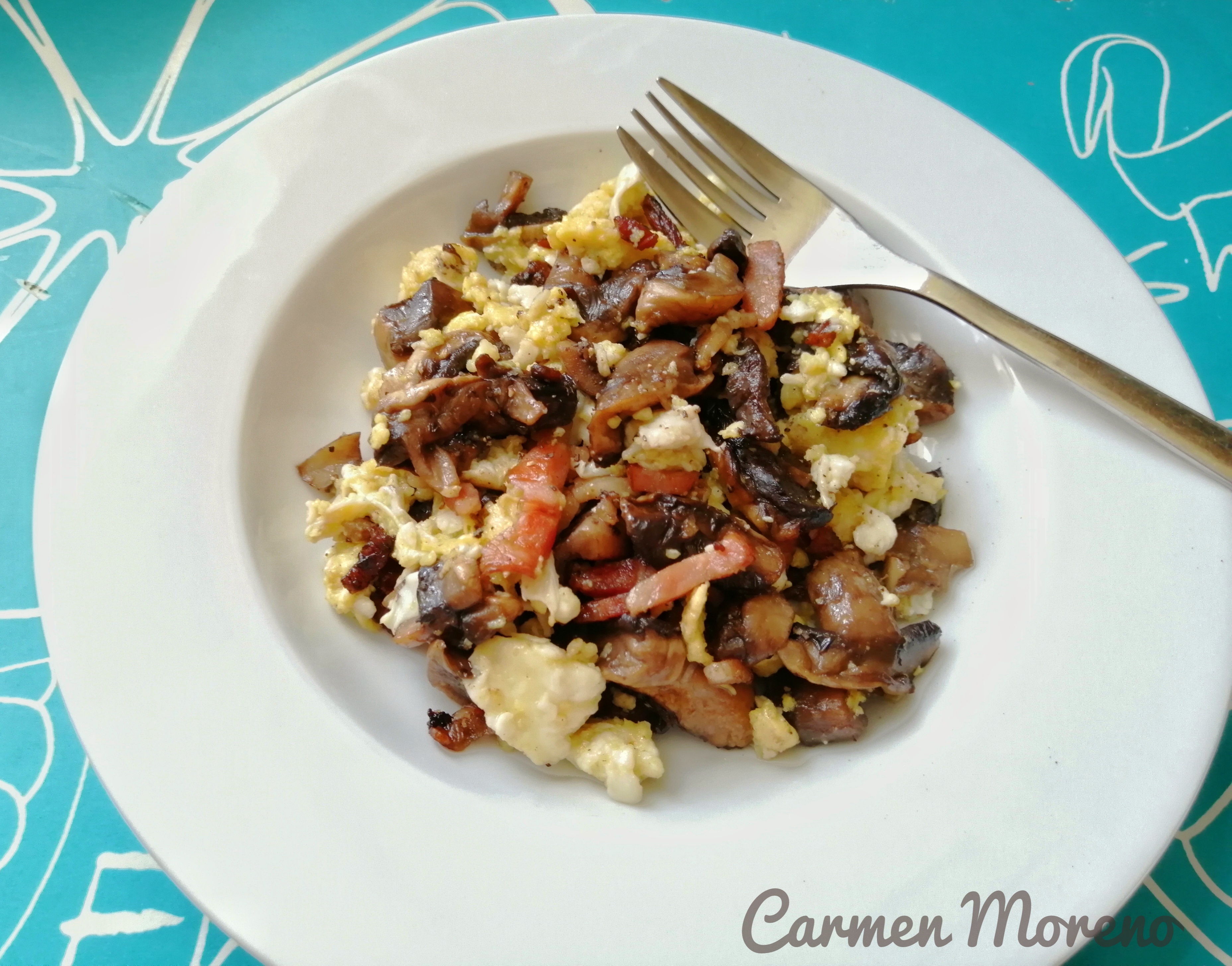 Huevos revueltos con beicon y champiñones salteados con Thermomix
