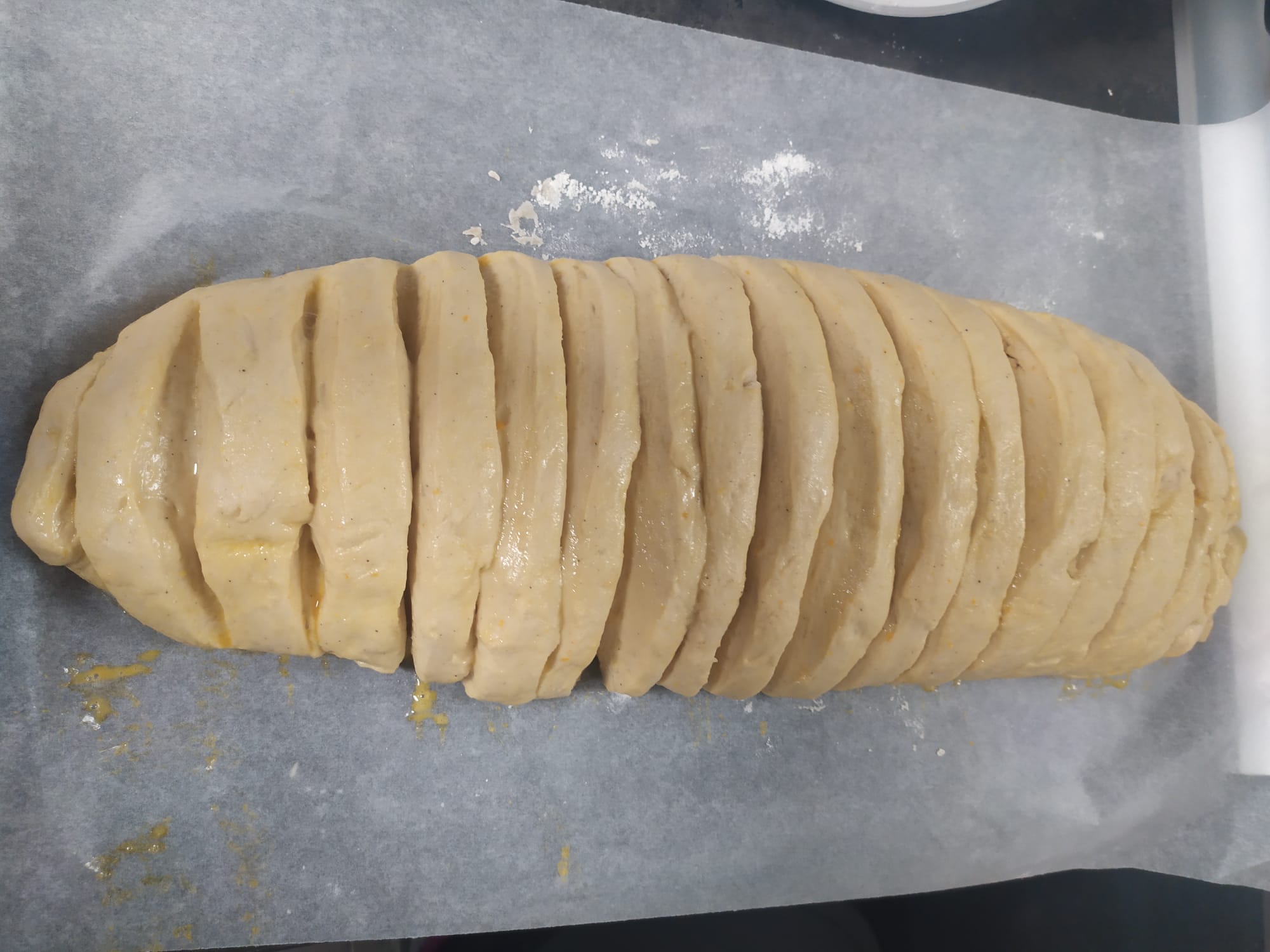 7. Hacer la forma deseada, en este caso alargado y para adelantar pre cortamos el pan con la forma de rebanadas.