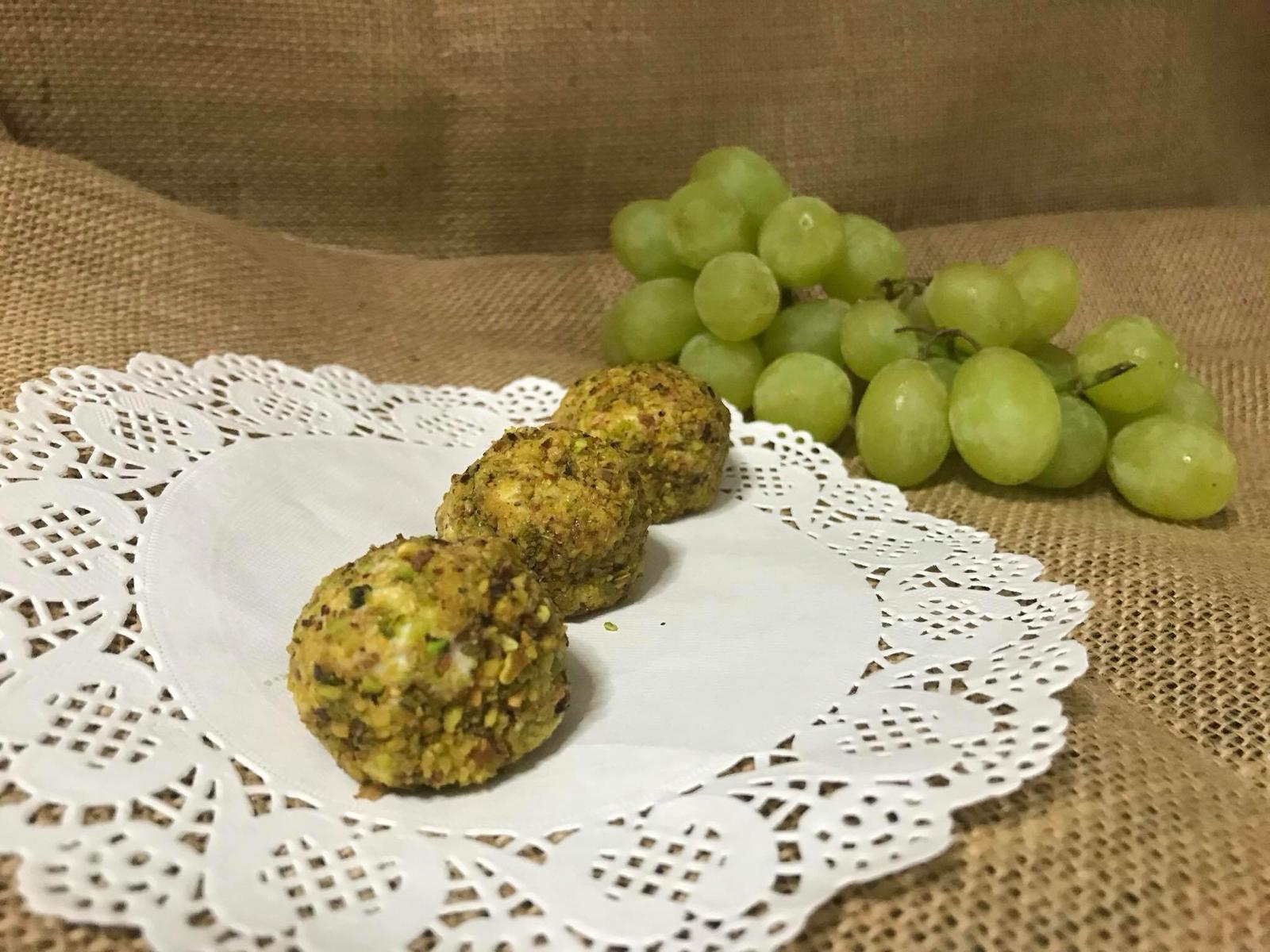 3. Con la ayuda de una cuchara de postre, cogeremos una porción de la mezcla de quesos, introducimos una uva dentro y con otra cuchara cubriremos la uva totalmente. Las bolas las iremos colocando en el plato con el pistacho picado para pasar a rebozarlas una a una. Posteriormente, las pasaremos a una bandeja y mantendremos en el frigorífico hasta la hora de servir.