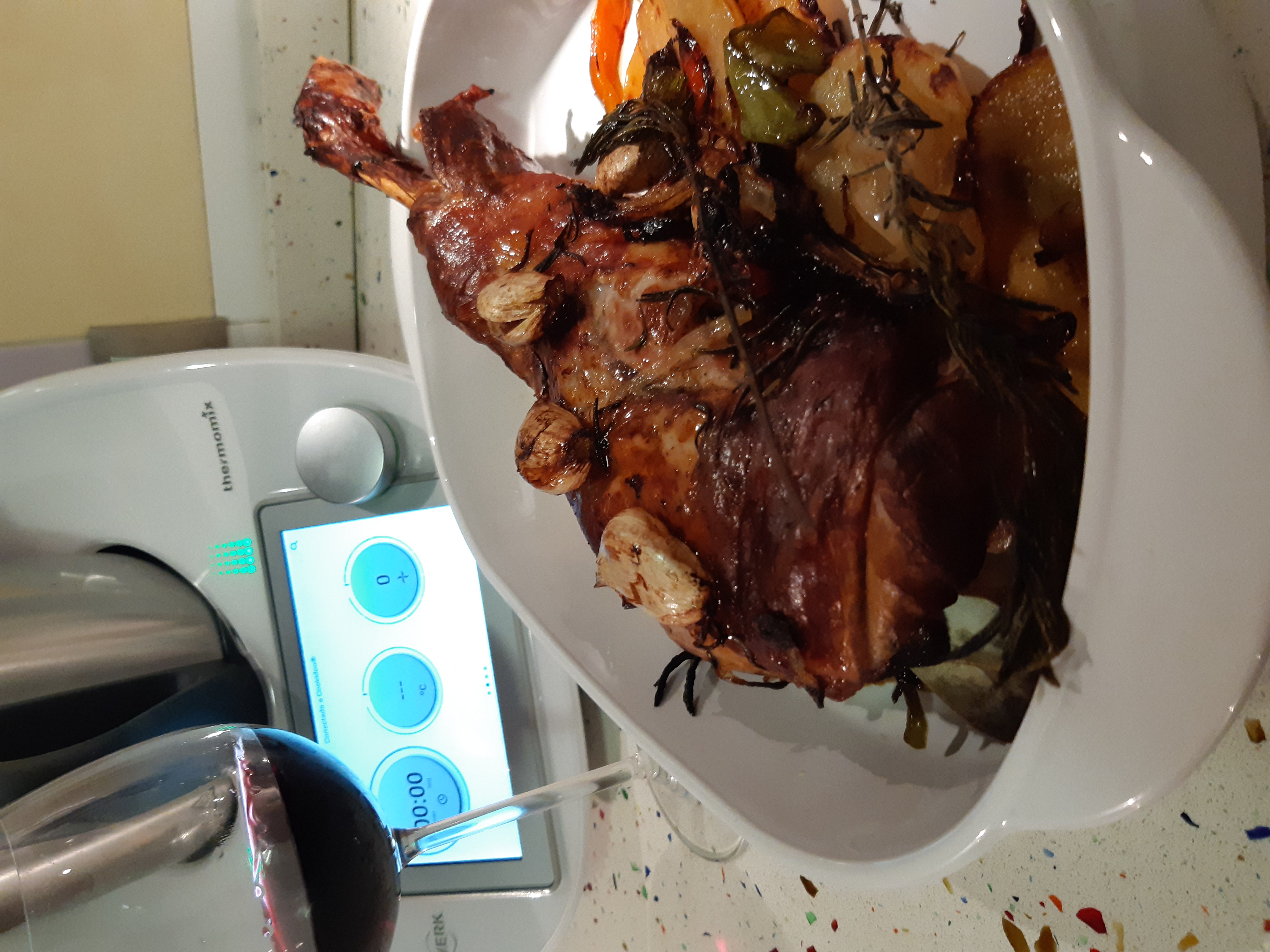 2 Ponemos en el vaso el agua el limón y mezclamos 5seg/vel 3, Vertimos sobre el cordero, añadimos el chorreon de Brandy sobre la paletilla. Secamanos el vaso con papel de cocina.