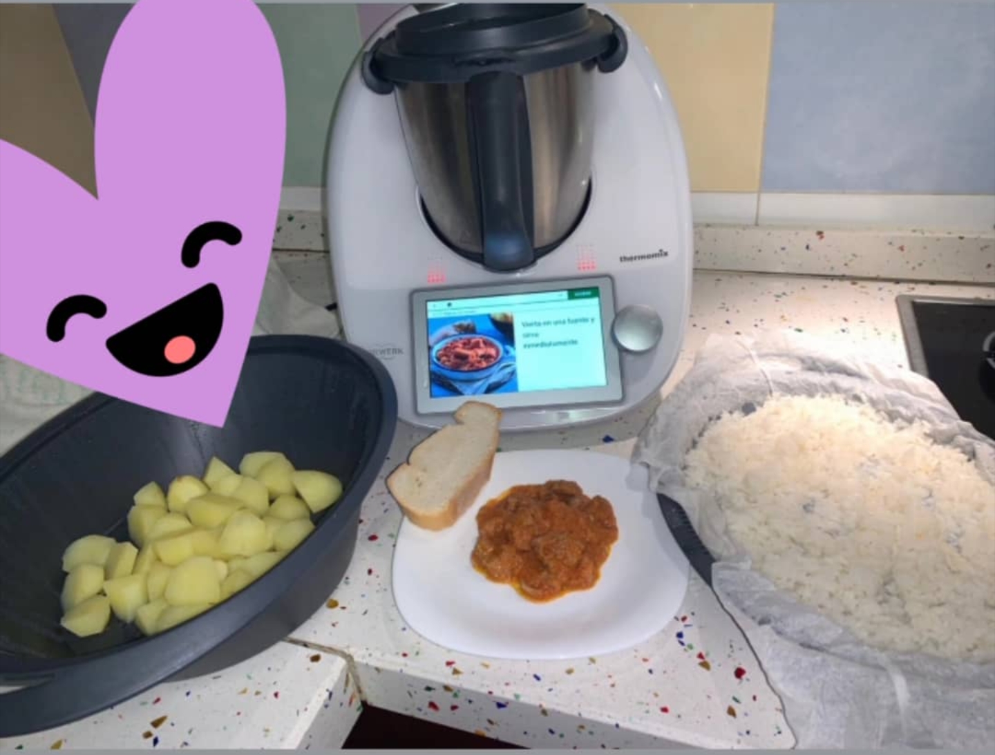 En esta ocasión ha sido magras con tomate y arriba unas patatas y arroz.... las patatas las puse en el recipiente varoma y el arroz en la bandeja varoma, la cual para que se haga bien ponemos un papel de horno para evitar que el agua se pierda por los agujeritos, ponemos el arroz redondo y el doble de agua, yo puse 200gr de arroz y 400gr de agua, una poca de sal y un ajo triturado y refrito en aceite AOVE, la receta os la detalló a continuación.