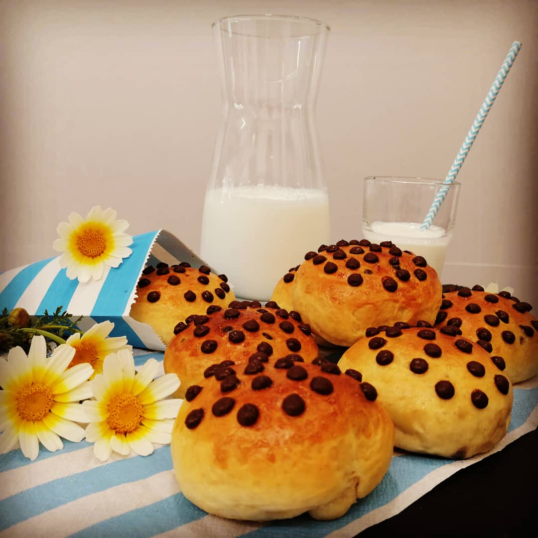 Una vez que están leudados, pinta los bollos con huevo batido y ponles las pepitas de chocolate por fuera, hornea 10 minutos a 180ºC con calor arriba y abajo o hasta que estén doraditos. A comer.