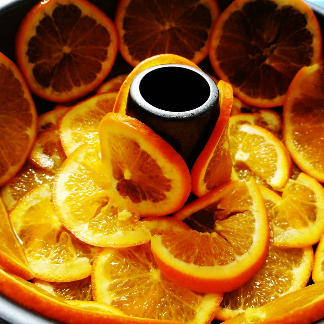 6. Una vez que le hemos puesto el aceite al molde, procedemos a colocar las rodajas de naranja, primero en la base, luego alrededor y como el mio es de corona también ponemos naranja en la parte del centro, en lad fotos podeis ver como se queda.
