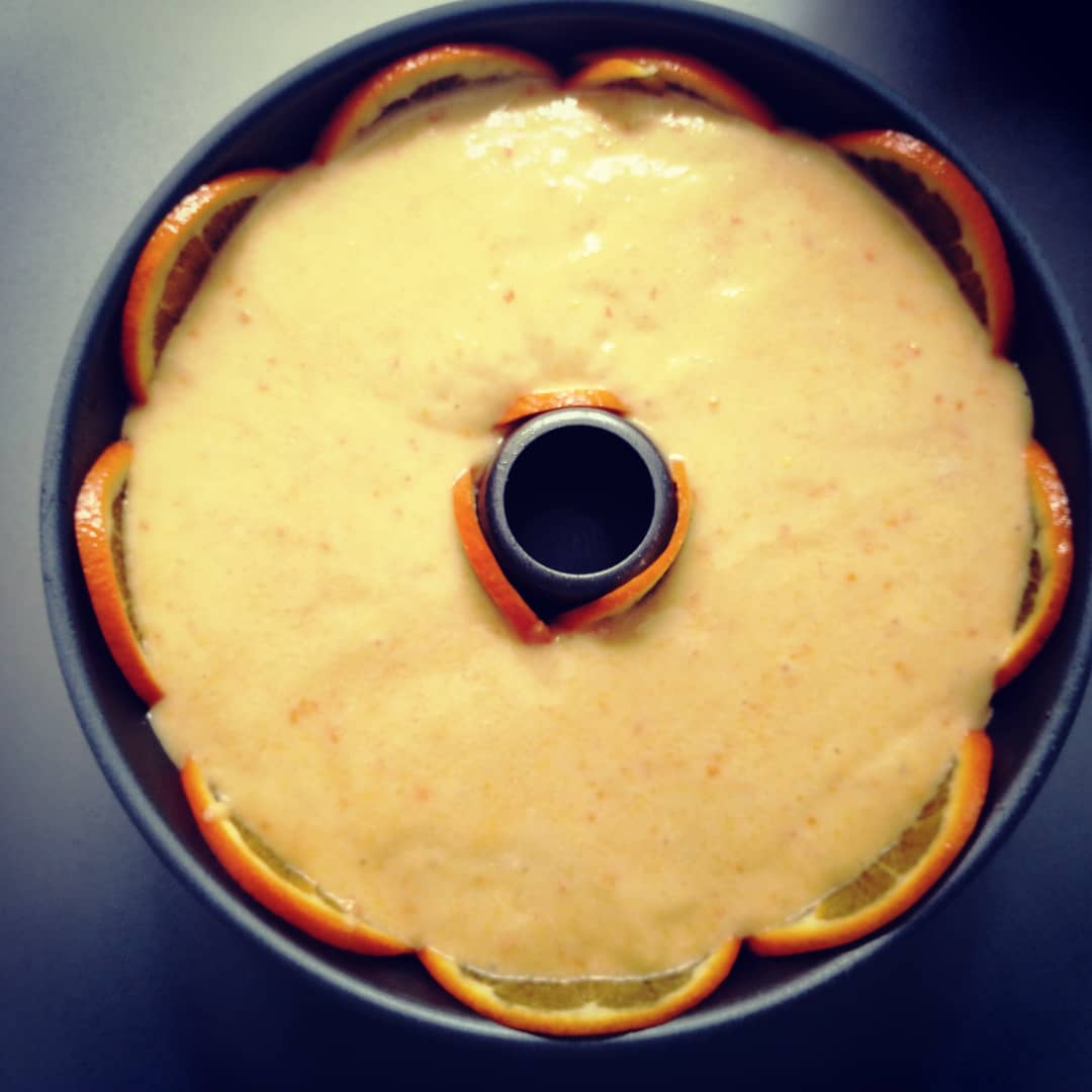 Es el clásico bizcocho de naranja de Thermomix® que está tan bueno y pensé y le ponemos unas rodajas de naranjas confitadas ya tiene que estar espectacular.