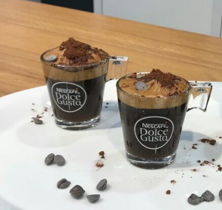 4.- Para la ESPUMA: ponga en el vaso el agua, el café soluble y el azúcar glas y mezcle 30 seg/vel.4. Reparta la espuma en los vasos y espolvoree por encima con el cacao en polvo.