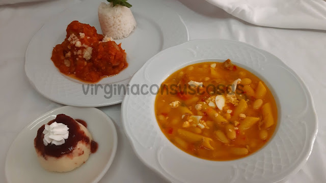 Menú: Sopa de judías blancas y fideos. Albóndigas con arroz y salsa de tomate. Cheesecake con Thermomix