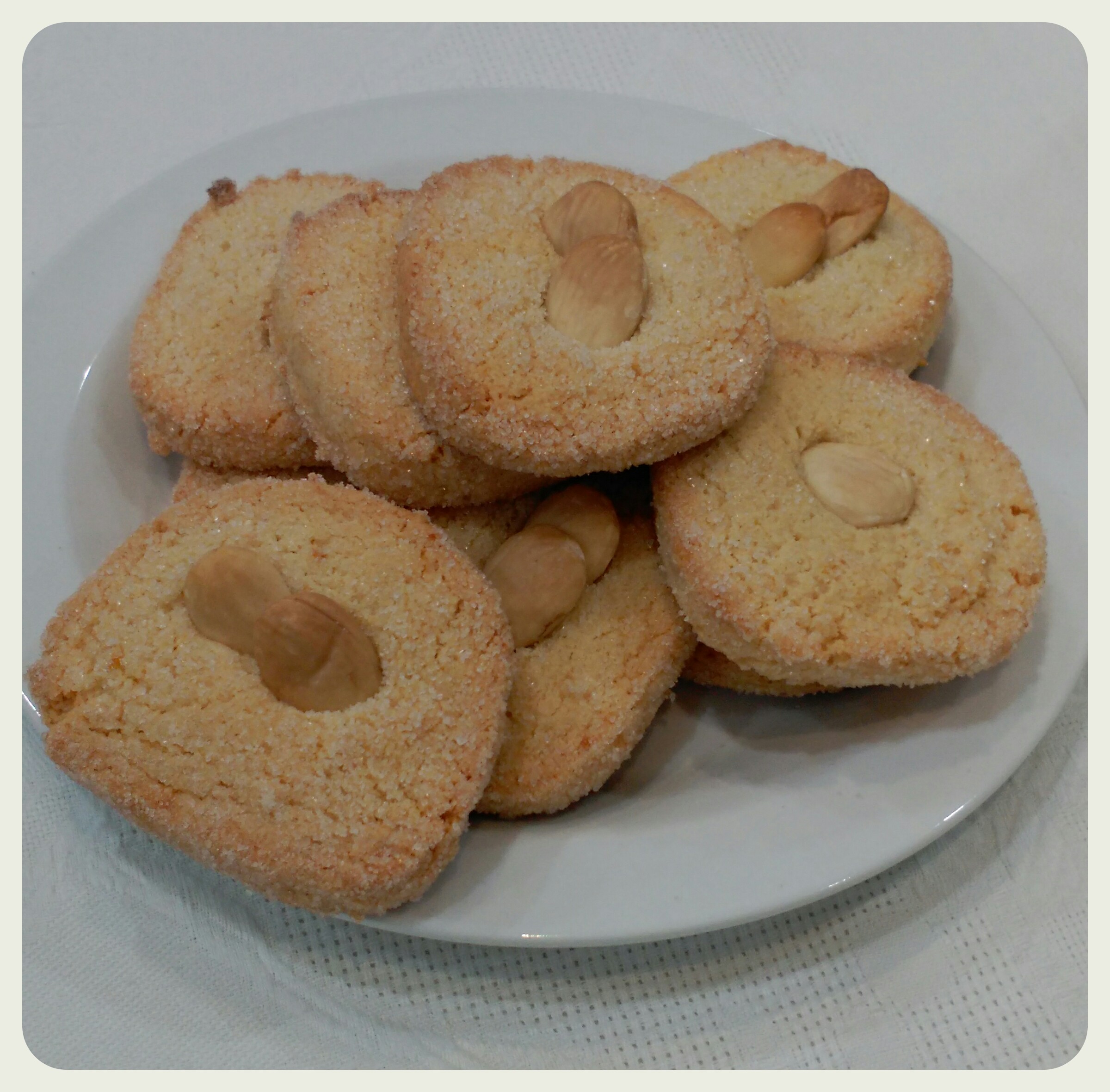 3.- Precaliente el horno y saque el rollo de masa del frigo , desenvuelvalo y corte a ruedas. Reboce cada rueda en azucar y coloque una almendra clavada en el centro.