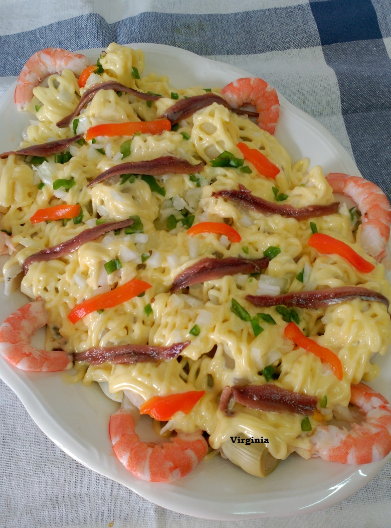 VARIACIONES: Puedes poner surimi, huevos de codorniz, otro pescado que no sea merluza : salmon fresco o incluso bacalao fresco cocido de igual forma que la merluza. Aunque a mi, personalmente, no me gusta ponerle atun en aceite o natural porque se apodera del sabor del plato, si a ti te gusta puedes poner lo que quieras!!!.