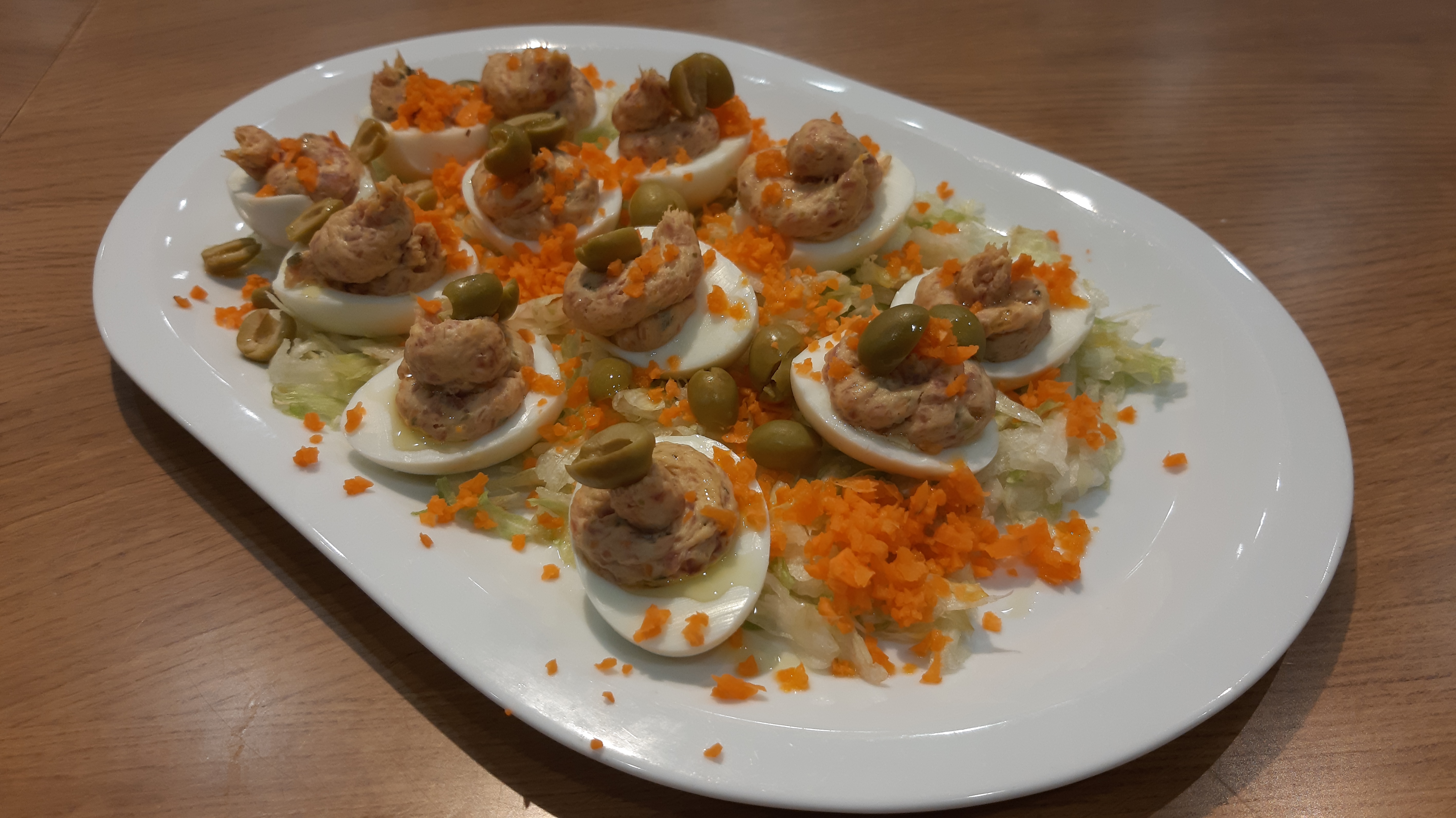 5.- Añada las yemas de los huevos cocidos, el queso, los pepinillos y la mostaza y triture 20 seg/vel 8. Vierta la pasta en una manga pastelera con boquilla rizada y vaya rellenando las claras de huevo. Póngalos en el recipiente sobre la lechuga y decore con la zanahoria rallada y las aceitunas. Riegue los huevos con el aceite en el momento de servir.