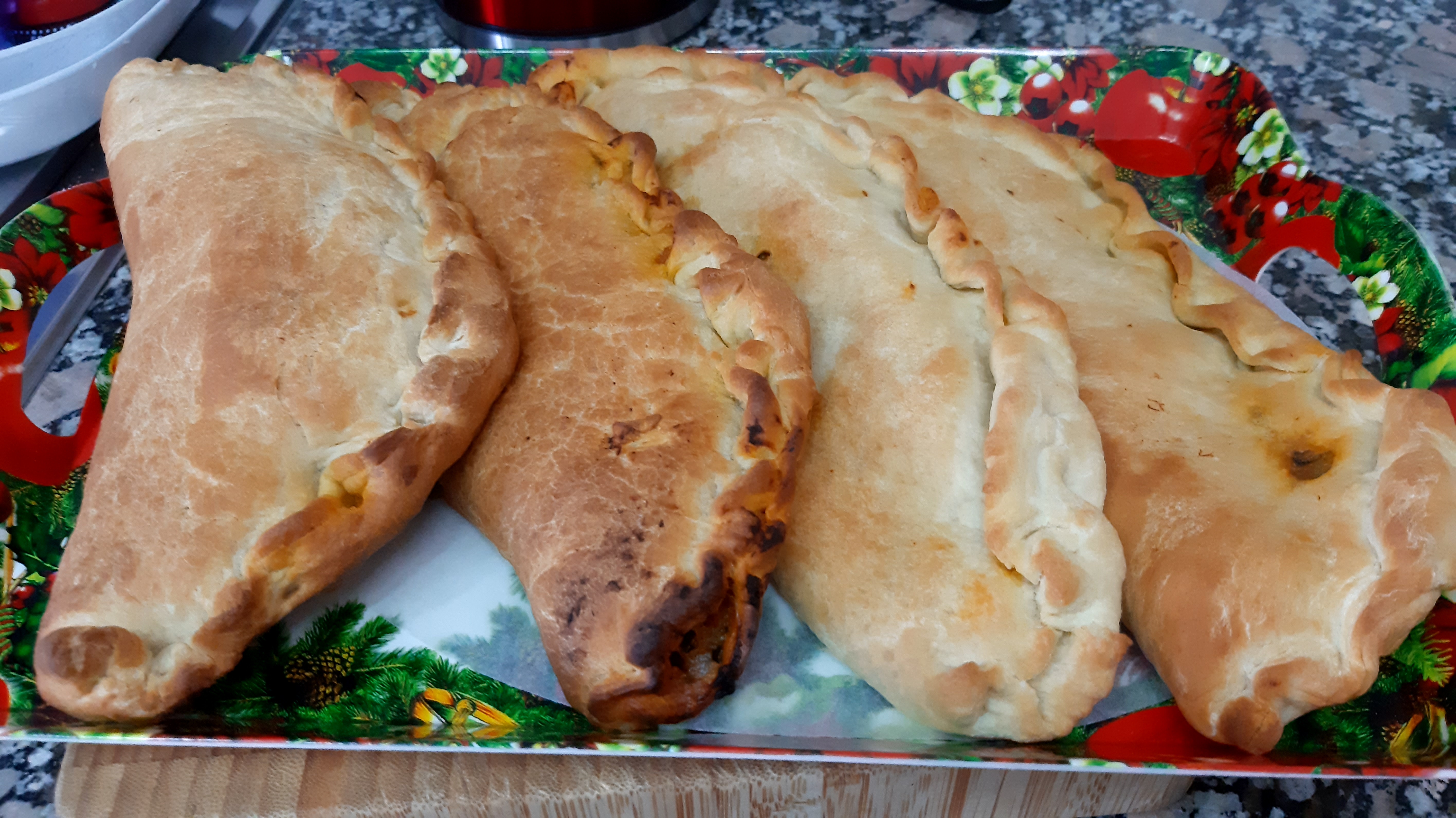 6.- Divide la masa en 4 partes iguales y, con el rodillo, extiende cada una en una superficie espolvoreada con harina hasta tener un disco de aprox. Ø 25 cm. Distribuye el pisto, el atún y los huevos troceados en el centro de cada disco y dobla por la mitad. Sella los bordes con la ayuda de un tenedor mojado en agua. Coloca las empanadillas en las bandejas preparadas y pincela con aceite de oliva.