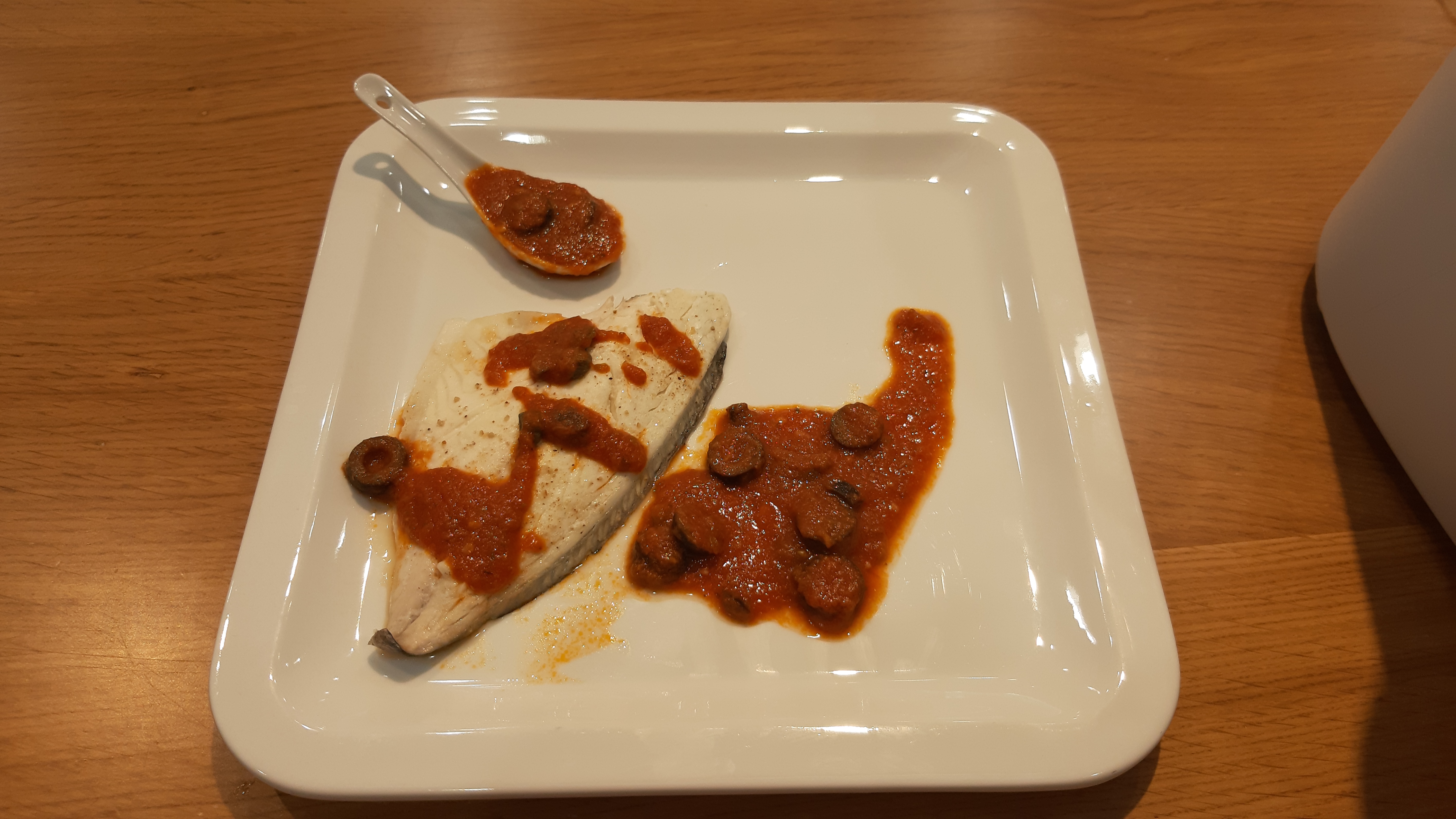 Incorpore el tomate, las aceitunas y el orégano. Sitúe el Varoma en su posición y programe 15 min/Varoma//vel 1. Retire el Varoma, ponga los filetes de dorada en una fuente, vierta la salsa del vaso por encima y sirva.