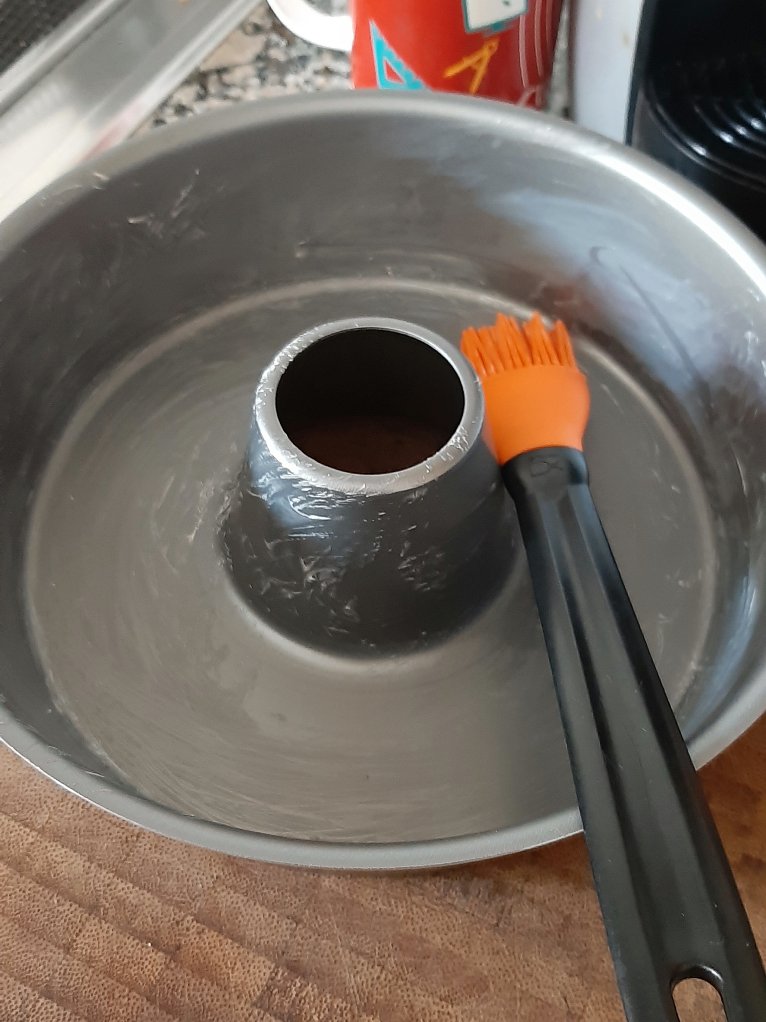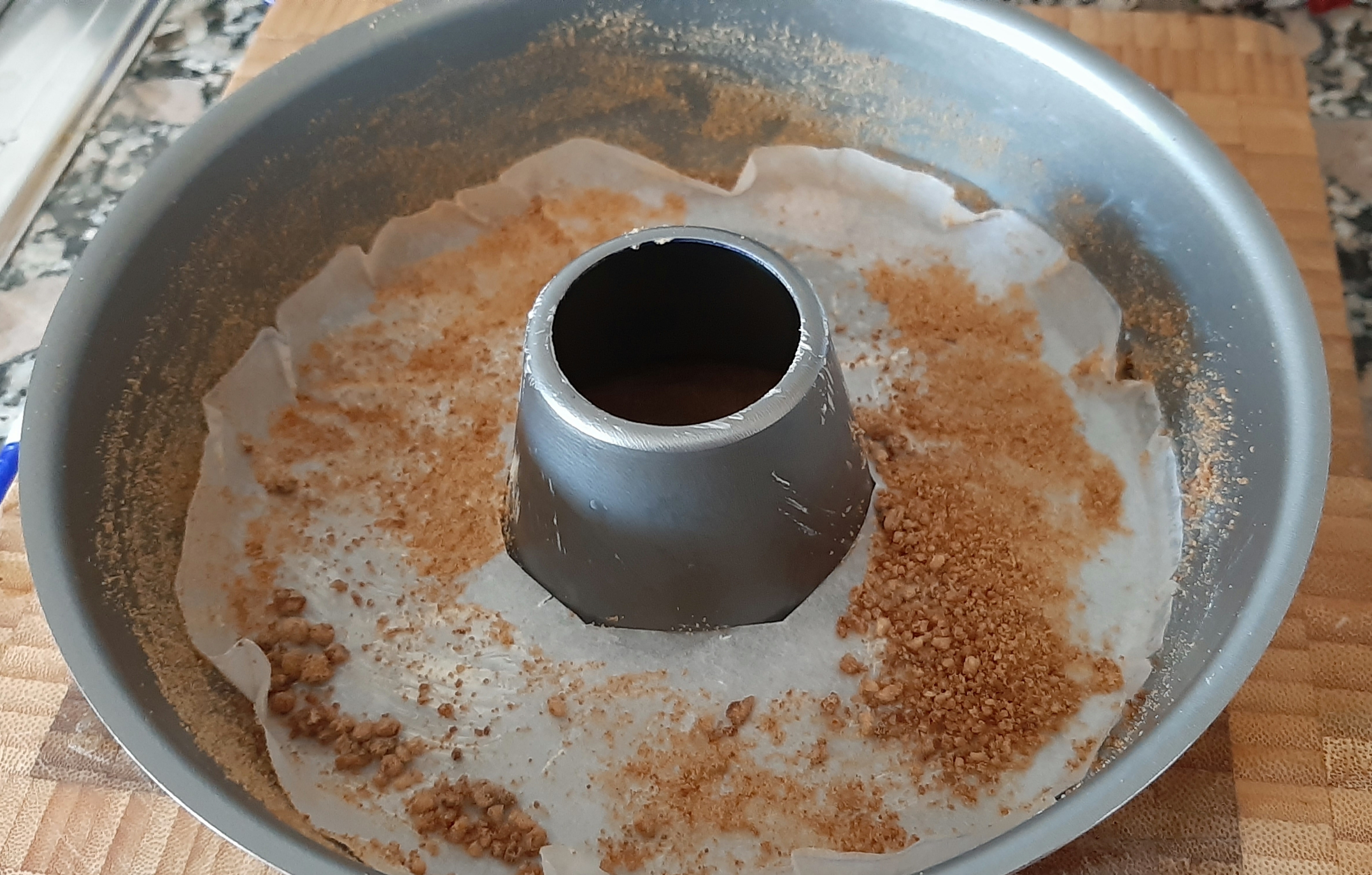 1.- Pinte con mantequilla un molde de corona de aluminio de Ø 21 cm y 6 cm de alto o un molde de aluminio desechable de cake de 1 litro de capacidad. Forre la base del molde con papel de hornear (vea la sugerencia). Pinte también el papel con mantequilla y espolvoree la base y las paredes con el azúcar moreno.