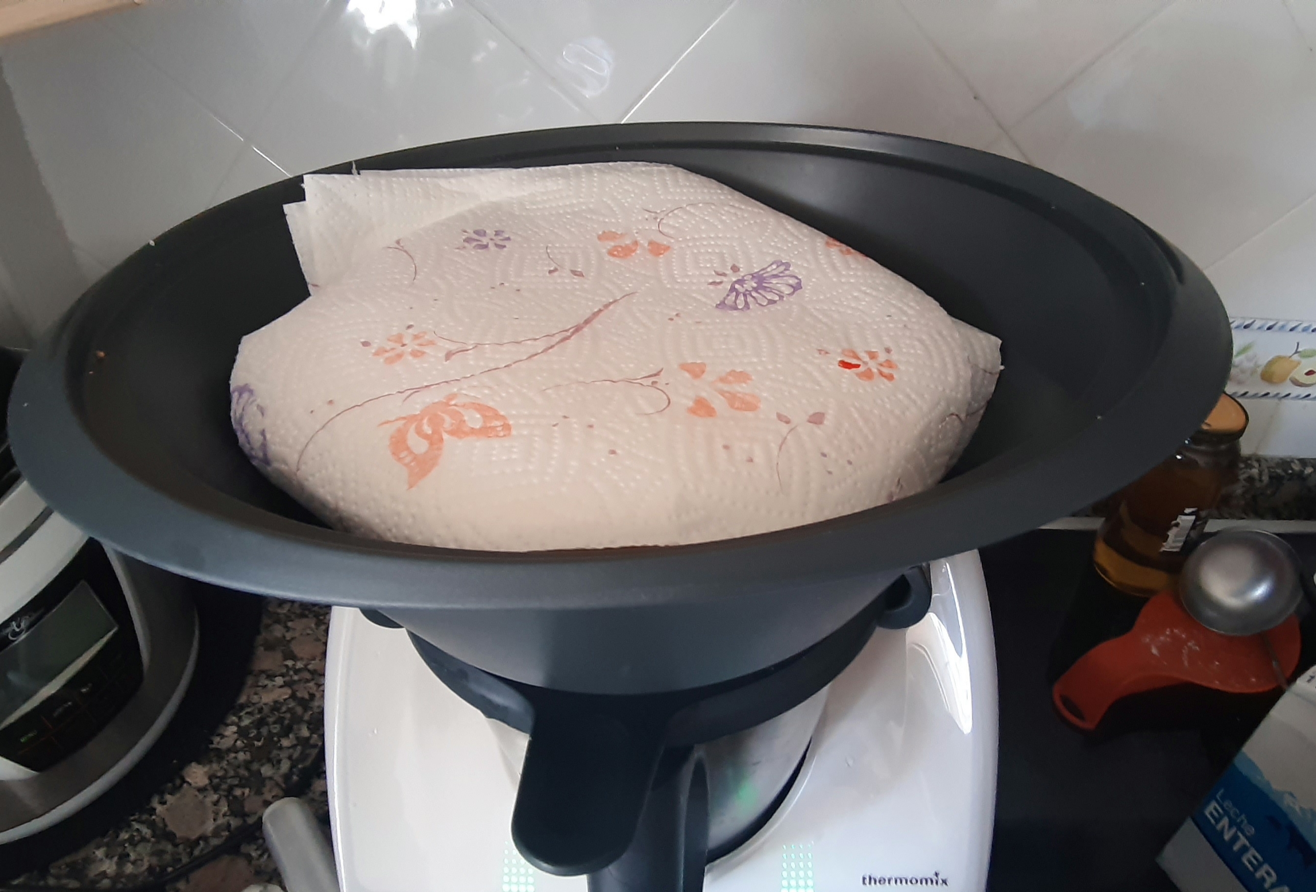 Ponga en el vaso el agua, Sitúe el recipiente Varoma en su posición con el molde cubierto con film transparente y coloque encima del molde 2-3 hojas de papel de cocina. Tape el Varoma y programe 45 min/Varoma/vel 1. Retire el molde del Varoma y desmóldelo mientras está caliente. Vacíe el vaso.