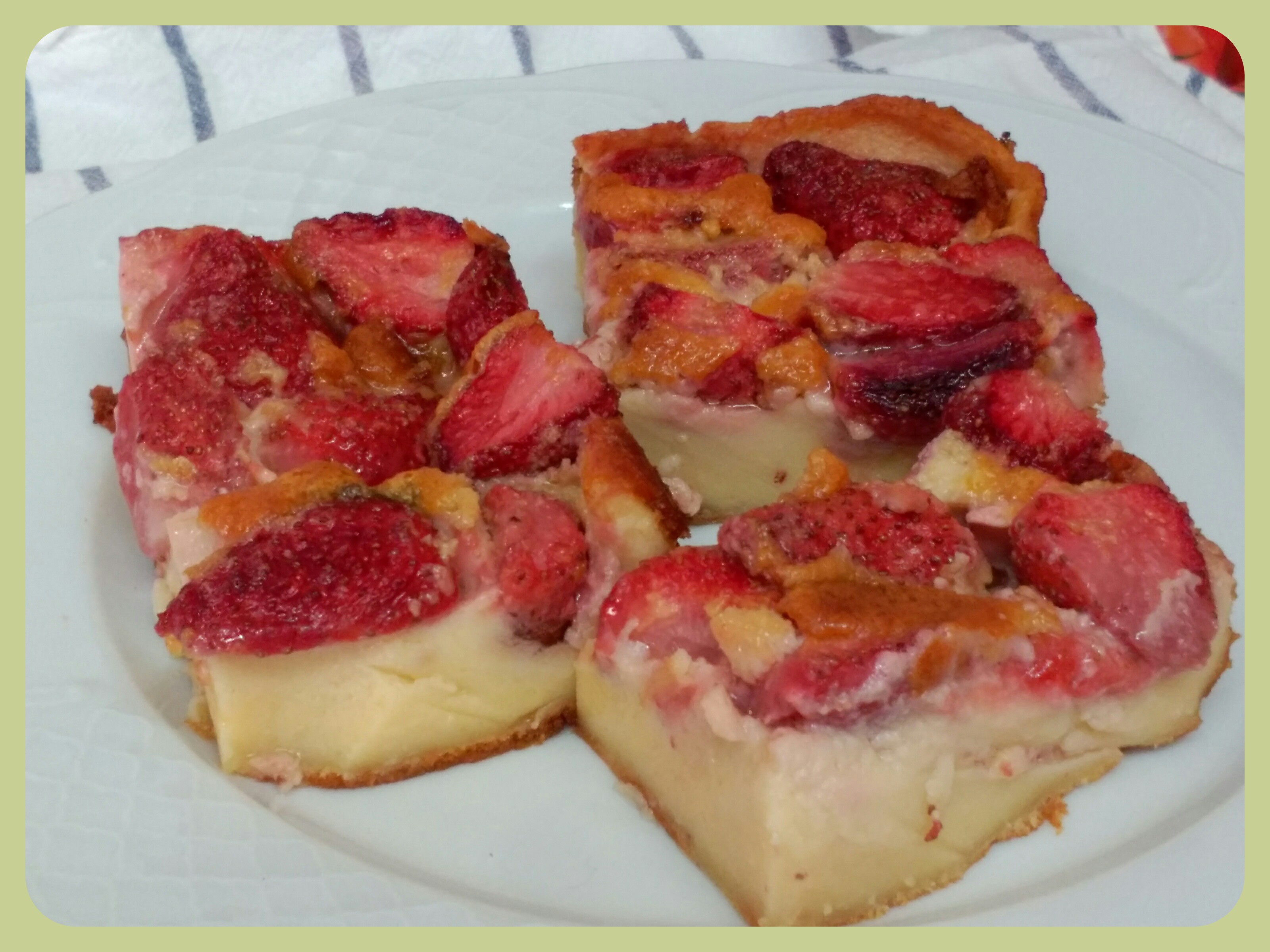 NOTA: Puede cambiar las fresas por cualquier otra fruta ( cerezas, manzanas, peras, melocoton) o incluso hacer este pastel sin fruta, en un molde más pequeño para que no quede muy fino.
