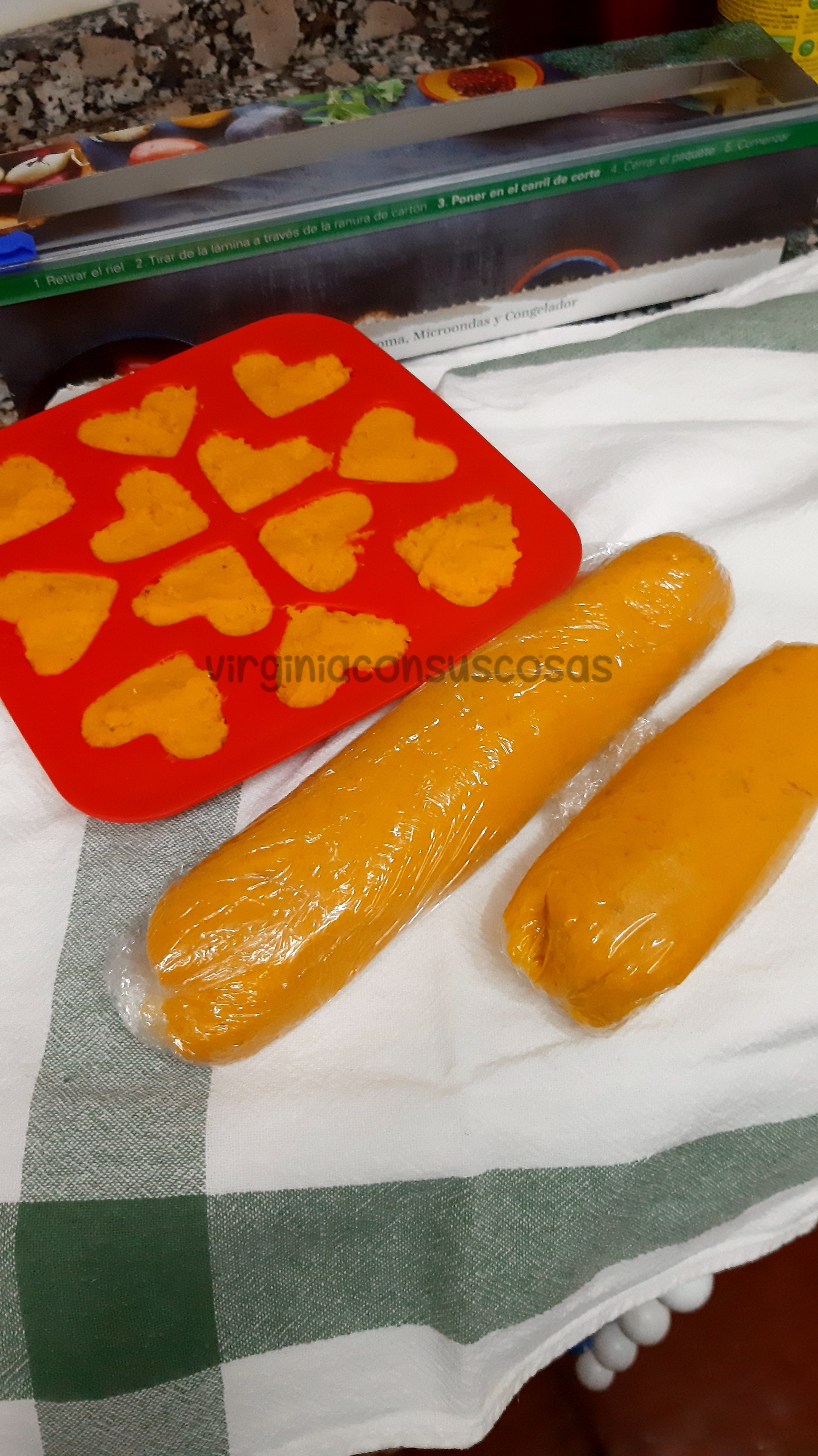 Yo he hecho dos versiones: en cubiteras y al congelador , luego desmoldo y de nuevo al congelador . y la otra es que he hecho un rollo y cuando esta congelado lo meto al micro 10 segundos para poder cortarlo a ruedas facilmente. Luego lo vuelvo a congelar rapidamente que no se descongele.