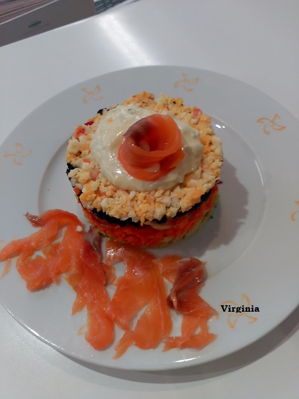 7.- Con ayuda de un aro de emplatar v colocando en este orden por capas: lechuga, zanahoria, pimiento rojo y cebolla, aceitunas negras y huevos. Retira el aro, riega con la salsa tartara y acompaña y adorna con los ahumados.