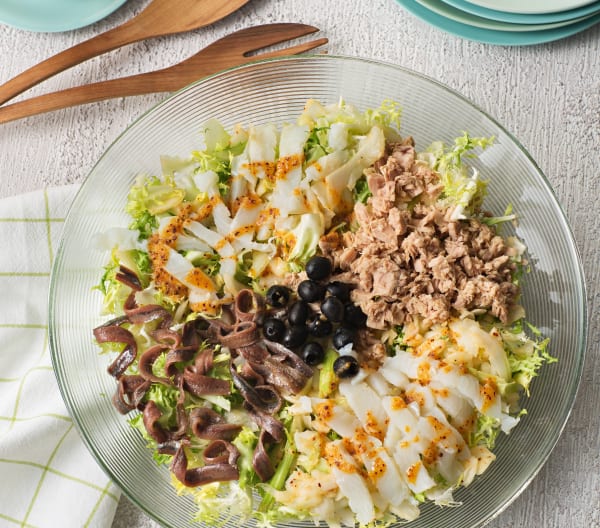 4.- Coloque en una ensaladera las hojas de escarola bien limpias, la cebolleta y el apio, las aceitunas, el atún desmenuzado, el bacalao y las anchoas. Riegue con la salsa reservada y sirva.